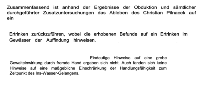 Dieses Adjektiv spielt im weiteren Verlauf dieser Geschichte noch eine wichtige Rolle. Die Staatsanwaltschaft Krems hatte nach dem Auffinden von Pilnaceks Leichnam zunächst ein Verfahren gegen Unbekannt wegen des Verdachts der fahrlässigen Tötung eingeleitet, dieses dann aber alsbald wieder geschlossen, nachdem die gerichtsmedizinische Untersuchung Tod durch Ertrinken ergeben hatte.